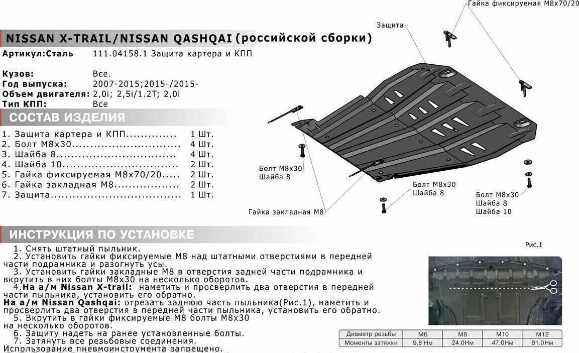 Защита картера ( двигателя) и КПП Автоброня для Nissan X-Trail T31, T32 (2007-2015, 2015-), Nissan Qashqai J11 (2014-) 111041581 Автоброня (РФ)